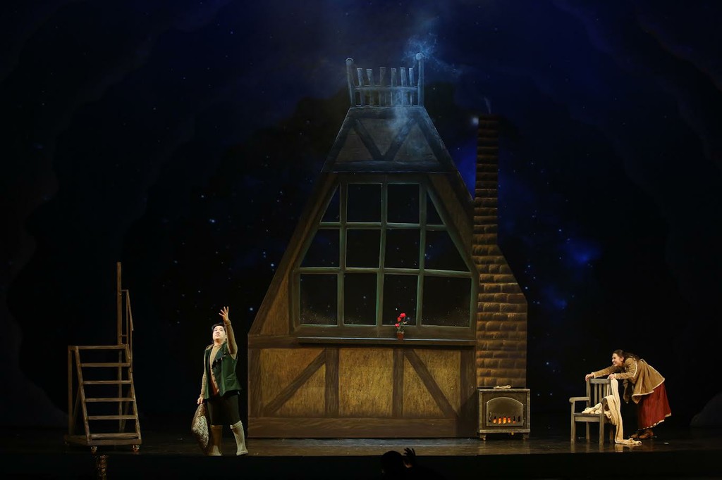Сценография спектакля (сценограф и автор костюмов Елена Орлова) — легкие передвигающиеся конструкции, которые превращают сцену то в городскую площадь, где Кай (Савва Хастаев) попался на глаза Снежной королеве, то в дом Бабушки (очень заразительная и обаятельная Елена Витман), то в стан разбойников.