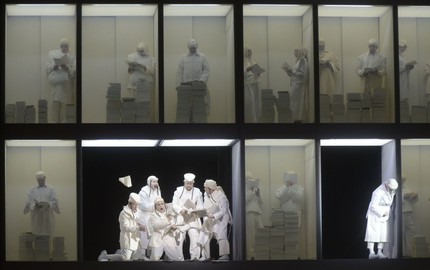 На сцене преобладает белый цвет, а точнее его естественный, чуть желтоватый оттенок, напоминающий пергамент.