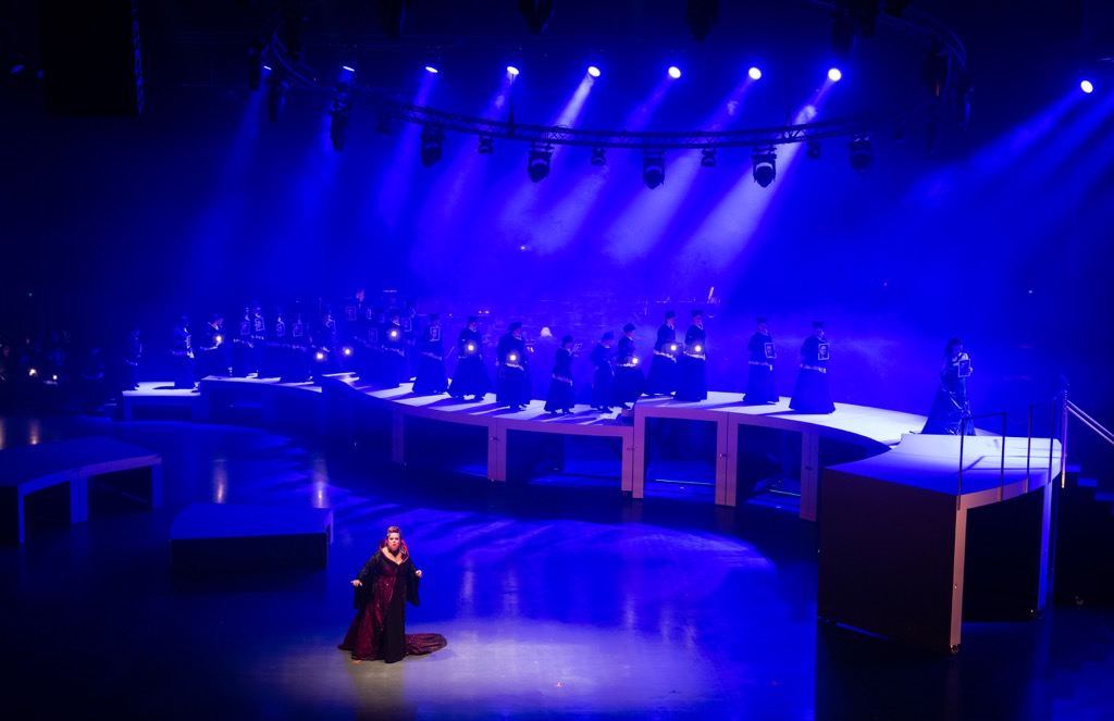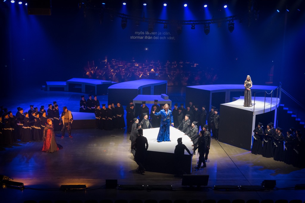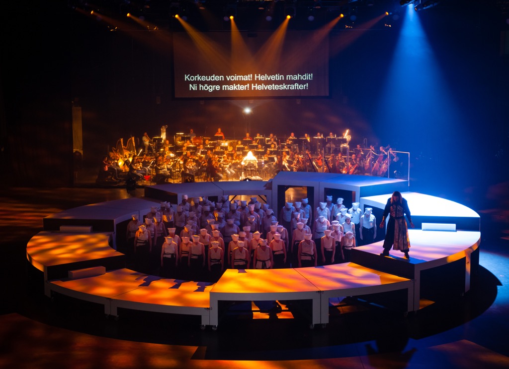 Сегерстам, кстати сказать, управляет звуковой массой спокойно, сдержанно, без малейшего намёка на внешнюю экстатичность. Да и располагается оркестр в самой глубине сценической площадки, позади грандиозных станков, многолюдного хора и солистов. И лишь множественные мониторы удобно для вокалистов и заинтересованной публики транслируют работу дирижёра.