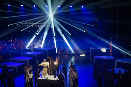 Вот этот самый ритуал ковки отнюдь не меча, а мирного САМПО — и есть кульминация. Станки выстраиваются в массивный круг, его внутренность заполняется одноликой хоровой массой, Илмаринен и Исме — на разных полюсах окружности. И следует мощный оркестрово-хоровой пласт с участием солистов, в котором вся сила в красоте звучания и сногсшибательном освещении 60-ти (!) прожекторов-пушек.