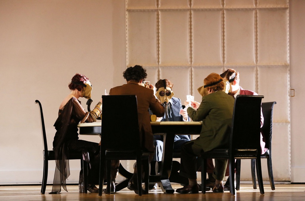 Партенопа, элегантная, хрупкая, в изысканных нарядах — и ее молодые люди — типичные и узнаваемые представители того общества. Поле боя находится исключительно за карточным столом, а скорее всего в будуаре. Ветры дальних и недавних баталий колышут тонкие занавески, а противогазы и каски красноречиво напоминают нам о той эпохе.