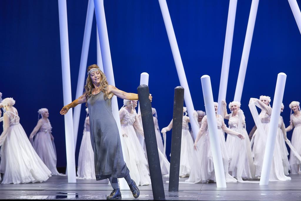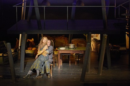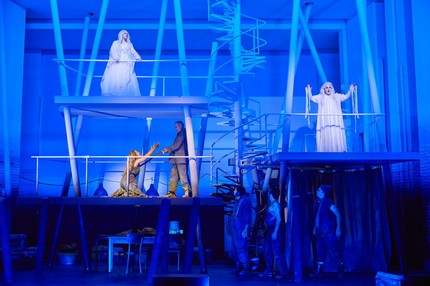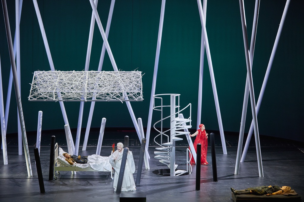 Эту «дышащую свежестью» идею режиссёр проводит, применяя стандартные, многократно испытанные постановочные «кирпичики». Винтовая лестница как канал связи между верхом и низом, двойники, сумасшедший дом, расстановка фигур по «этажам», лес из балок, ведь всё это, кажется, уже где-то было? Некоторые элементы, например, белоснежные волосы, Кригенбург использовал в своей постановке вагнеровского «Золота Рейна» в Баварской опере.