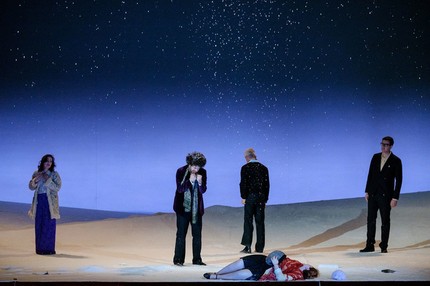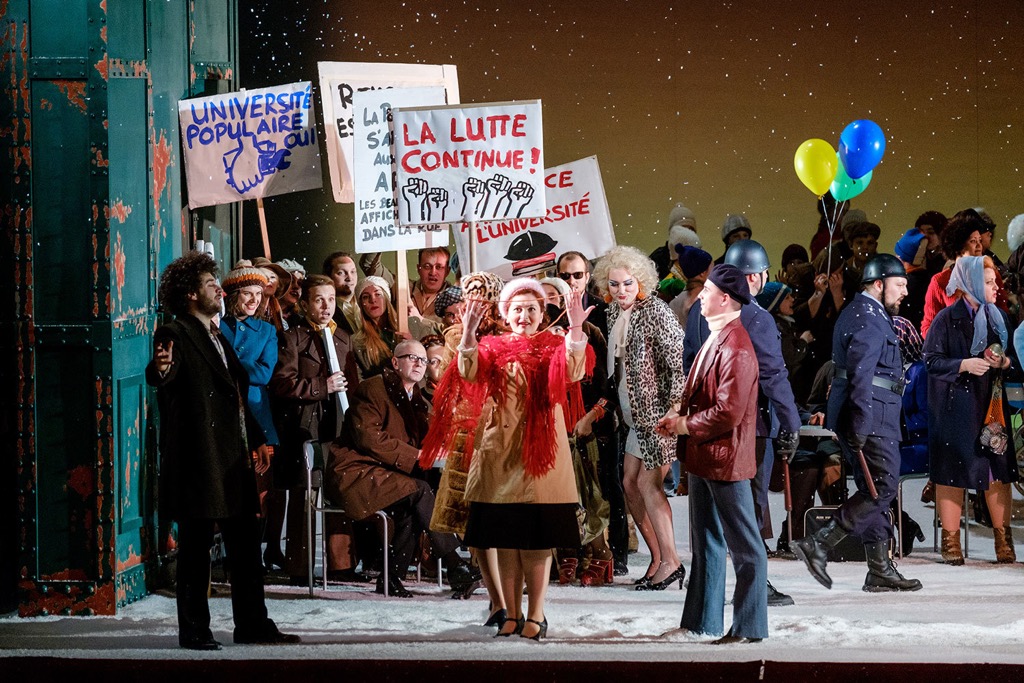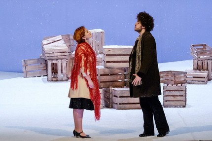 Эта опера похожа и на рождественский стеклянный шар: если игрушку хорошенько встряхнуть, внутри закружатся блестящие снежинки. Такое «взбалтывание» произвели в Пермском театре. Причем, снег начал падать не только в самом спектакле, но и на улицах города. Новую постановку создали совместно с Фестшпильхаусом Баден-Бадена. Международная команда во главе с режиссером Филиппом Химмельманом и дирижером Теодором Курентзисом решила, что действие нужно перенести из 30-х годов XIX века в 60-е XX столетия.