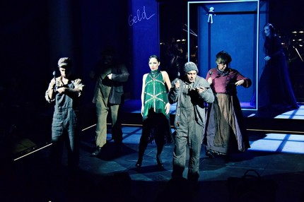 Событийная точка для репертуара московских театров заметная: музыку Вайля особенно нигде и не услышишь, а здесь целый «балет с пением», где и фокстрот, и шимми, и диксиленд, и вальс, и кроме того еще пролог из семи зонгов. Иллюзия простоты — просто иллюзия, и музыка, с почти бэндовым составом исполнителей (среди них ударные, кларнет, аккордеон), скучать не дает.