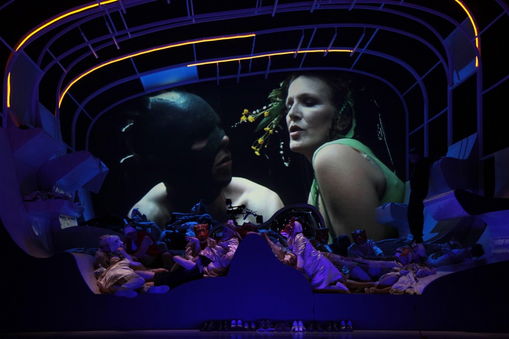 Поющие маски в спектакле были пациентами, клоунами и т.д. Бас (Поэт) Кристоф Хейнрих старался рычать посочнее. Лирический тенор Хиойонга Кима располагает бóльшими возможностями, чем проявившиеся в этой постановке. Сопранистки Ирина Дяшко и Нерита Поквитите изображали медсестёр.