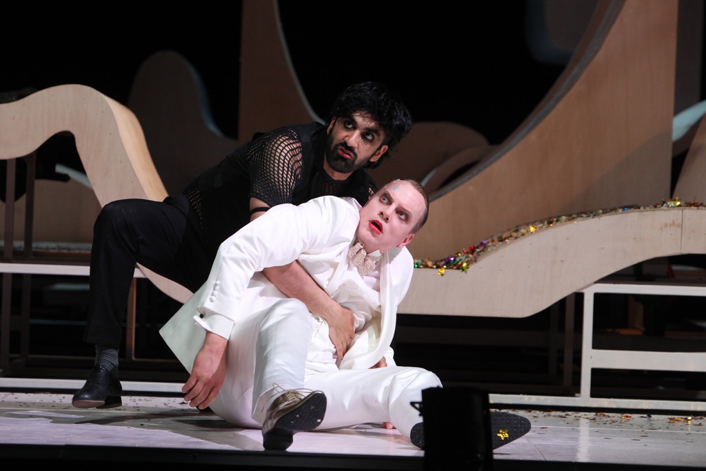 Контртенор Джон Латтимор в пышном красном платье и с длинными распущенными волосами делал вид, что отвергает пылкие ухаживания баритона Биргера Радде. Несмотря на китчевый эротизм оформления, сценическое обаяние Латтимора и общий задор на какое-то время действительно возродили дух театра времён английской Реставрации, а игровое нарушение традиционных границ между полами доставило весёлое удовольствие. Партия была написана Пёрселлом для контртенора изначально, и именно этот ход соотечественника подтолкнул Бриттена к тому, чтобы в его собственной опере «Сон в летнюю ночь» этим голосом пел Оберон (что тогда было оригинальным шагом).