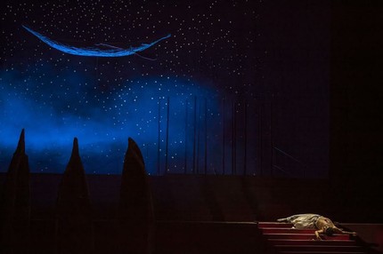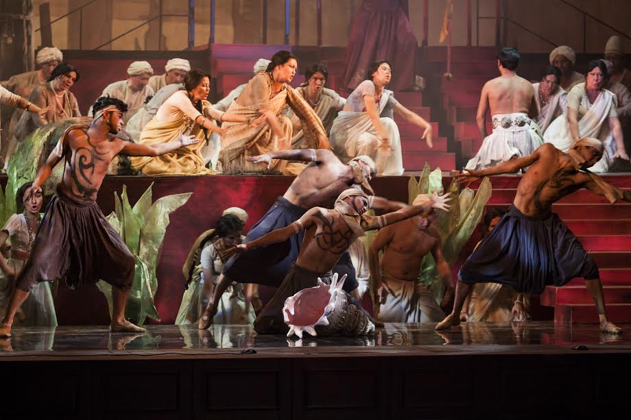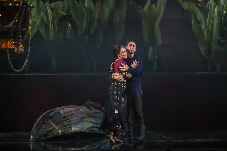В этой постановке и свет естественный (художник по свету – Ирина Вторникова): где-то в поднебесье сцены рождаются мягкие сумерки, неведомо откуда-то появляются перекрещивающиеся лучи, над горизонтом разгорается пламя. Выбор в пользу лаконичности сделан художником по костюмам Татьяной Ногиновой. Сверкает только костюм Лейлы-жрицы, но не менее выразителен и темный костюм «изменницы» в драматичном дуэте с Зургой. В сценографии, предложенной Эрнстом Гейдебрехтом, есть простота мифа. Божество, изображенное на дальнем плане, символизирует тот уровень бытия, который не подвержен страстям человеческим. Пусть этот далекий Бог больше Будда, чем Брахма: у российского зрителя именно Будда ассоциируется со спокойствием. Запоминаются почти монохромным решением финальные сцены: все строится вокруг глубокого синего цвета.