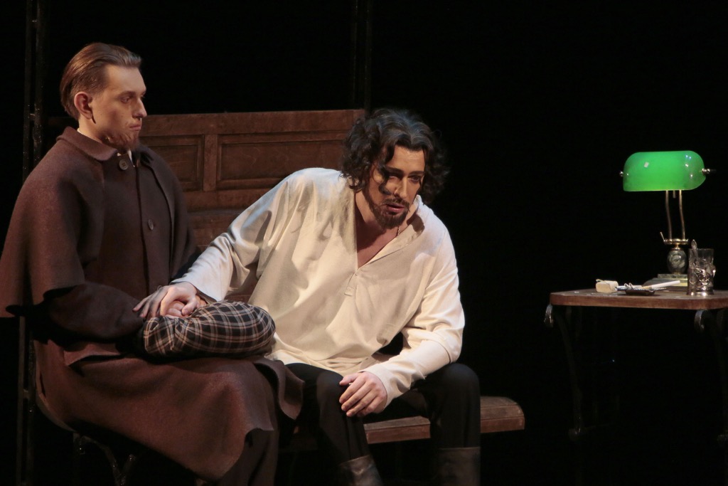 Три кита этой постановки, – в первую очередь, безудержно-темпераментный Рогожин в яркой, вальяжно-притягательной трактовке Петра Мигунова, затем чувственно тонкий типаж, кажется, отрешенного от мира сего князя Мышкина в исполнении Богдана Волкова, и, наконец, как ни странно, фигура пройдохи Лебедева (изумительная работа Константина Шушакова – неотъемлемо важный винтик спектакля!). В актерском отношении хороши и героини-соперницы Настасья Филипповна (Екатерина Морозова) и Аглая Епанчина (Юлия Мазурова), но их невыразительные по тембру (с проседающей дикцией) голоса берут лишь мощью посыла, абсолютных высот тройки мужских персонажей так и не достигая…