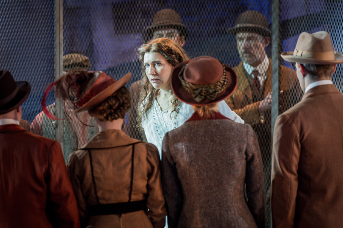 Задний фон «сцены» Holland Park Opera — фасад барского дома, будто перечёркнутый, ограниченный символическим забором, схематичными пейзажами Волги и реалистичной клеткой. В ней