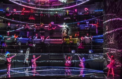 то зажигая разноцветные плоские шары, то устраивая космическую зиму в третьем акте, то пуская мелкие морские волны.