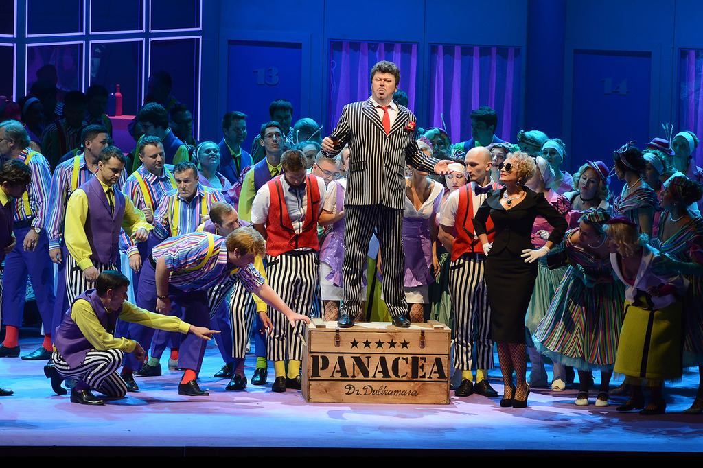 Дулькамара, привозя с собой ящик любовного снадобья с названием PANACEA, появляется и также уезжает в финале на шикарном вишневого цвета ретромобиле, специально арендованном театром у агентства бракосочетаний. Сделав круг за кулисами, это авто под финальные такты оперы возвращается на сцену вновь, и на сей раз из него выходит дирижер, заблаговременно покинувший яму и оставивший оркестр свободно плыть по течению разудалой мелодии баркаролы.