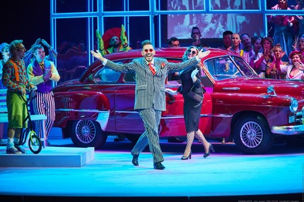 И это неудивительно, ведь на сей раз зрителю, если говорить именно о постановочно-визуальном аспекте, предложен весьма эксцентричный жанрово-стилистический коктейль. Он выдержан одновременно и в духе мюзикла, и в нарочито-зрелищной эстетике pin-up (пин-ап) – подчеркнуто фривольной, броской, характéрной для массовой плакатной графики Америки середины XX века. Английское to pin up как раз и означает прикалывать, и в данном случае pin-up – это буквально помещение на стену плаката-постера с броской и яркой аттрактивностью.