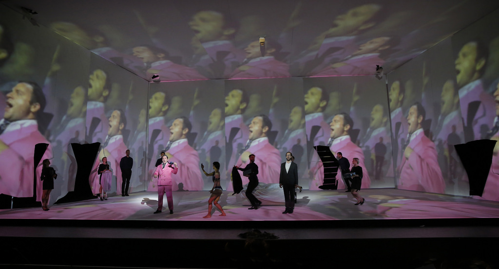 Действие спектакля развивается в стерильно белом пространстве куба с проекциями на стенах: Стравинский обращался к картинам Хогарта при выборе сюжета, а здесь изображения создают общий антураж, преображая его от сцены к сцене. Причина тому — искуситель Ник Шэдоу, прорезавший поверхность экрана и проникнувший в уютный пасторальный мир. Забрав Тома в шумный город, он приобщил его ко всем прелестям светской жизни с вечерниками и женщинами. На поверхности экрана возникает всё больше дыр. Оттуда в окошечке появляется бородатая Баба Турчанка (конечно же, в стиле Кончиты Вурст) — будущая жена Тома, а вместе с ней изо всех щелей её вещи, жирафы и даже лимузин.