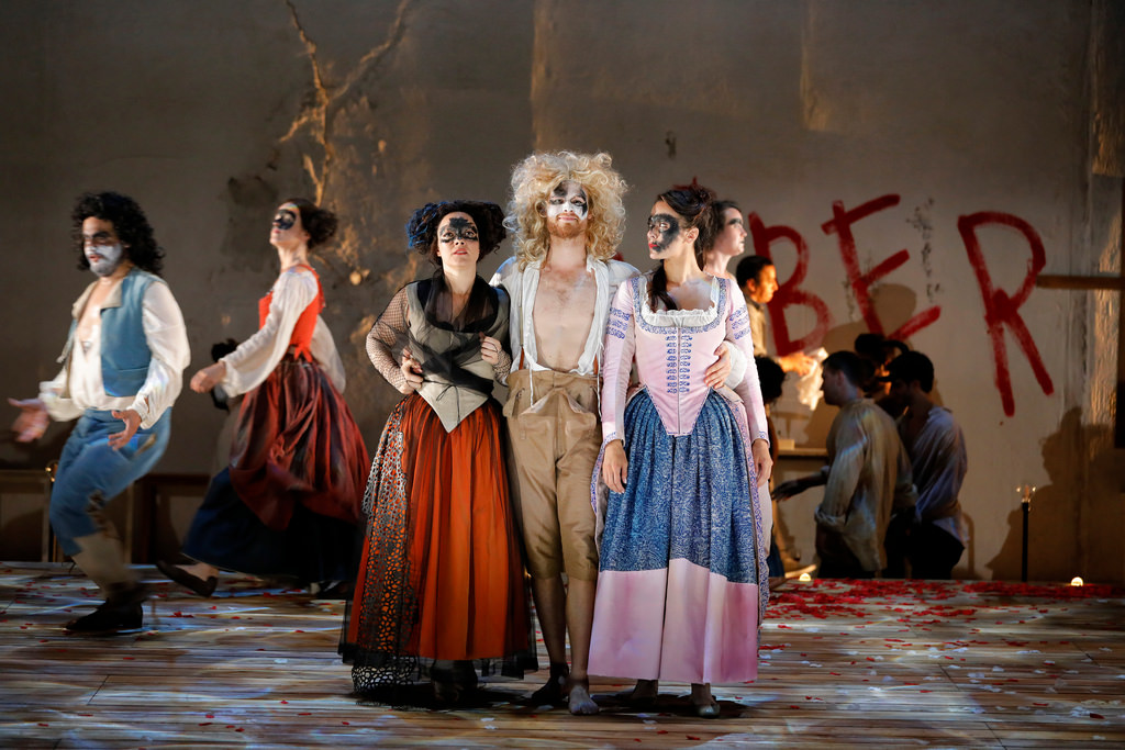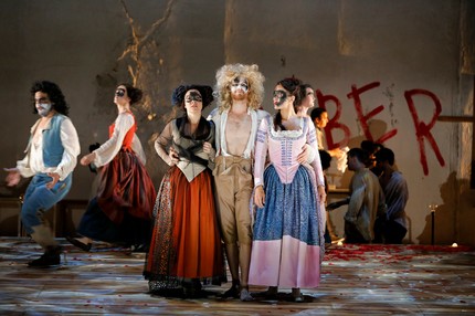 Открытая сцена спровоцировала режиссера на игривый тон: блестящий занавес посреди деревянных подмостков, переодевания, постоянные перебегания, игры со светом и выходы из зала. В жанре dramma giocoso явно сделан акцент на второе слово. Нарочитая театральность и типажность персонажей скрывается под маской уличного спектакля здесь и сейчас: по краям сцены актеры готовятся к выходу на площадку и наносят грим, и там же находятся столики для зрителей.