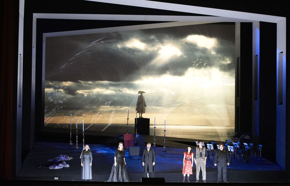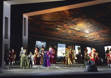 На этом фоне совершенный восторг произвела на меня постановка Ж.-Л. Мариноти. Мифологема «наклонной плоскости» издевательски красовалась в примитивно сбитой, но безумно уместной и первоклассно поданной сценографии (художник — Ханс Шавернох). Скошенные проёмы, умно подсвеченные изображения на задниках, заваленная перспектива на занавесе (художник по свету — Фабрис Кебур). Просто, функционально, профессионально, интеллектуально, хорошо. Костюмы озорные, но в тему (художник по костюмам — Йан Такс): живодёрская для глаза пестрота карнавальных нарядов в финале I акта выглядит настоящим буйством жизни и красок.