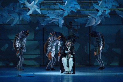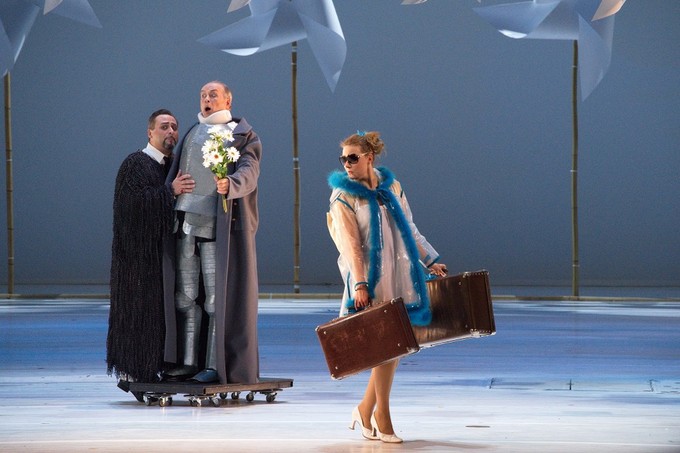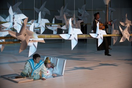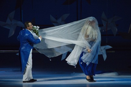 Как и 17 лет назад, мы снова попадаем в измерение просторной и светлой сценической коробки, в изящную наивность стильного «белого спектакля», поставленного практически на пустой сцене: весь его «подручный» мобильный реквизит выносится и уносится по ходу дела. Главная «фишка» сценографии Владимира Арефьева (он также и художник по костюмам) – система рей, беспрестанно опускающихся и поднимающихся по всему фронту и глубине заднего плана сцены. На них, словно ноты на линиях нотного стана, «сидят» крутящиеся пропеллеры-вертушки, задорные крестики-бантики. Почему так? Да кто ж знает! Но при этом как-то совершенно спокойно говоришь себе: «А почему бы и нет!»