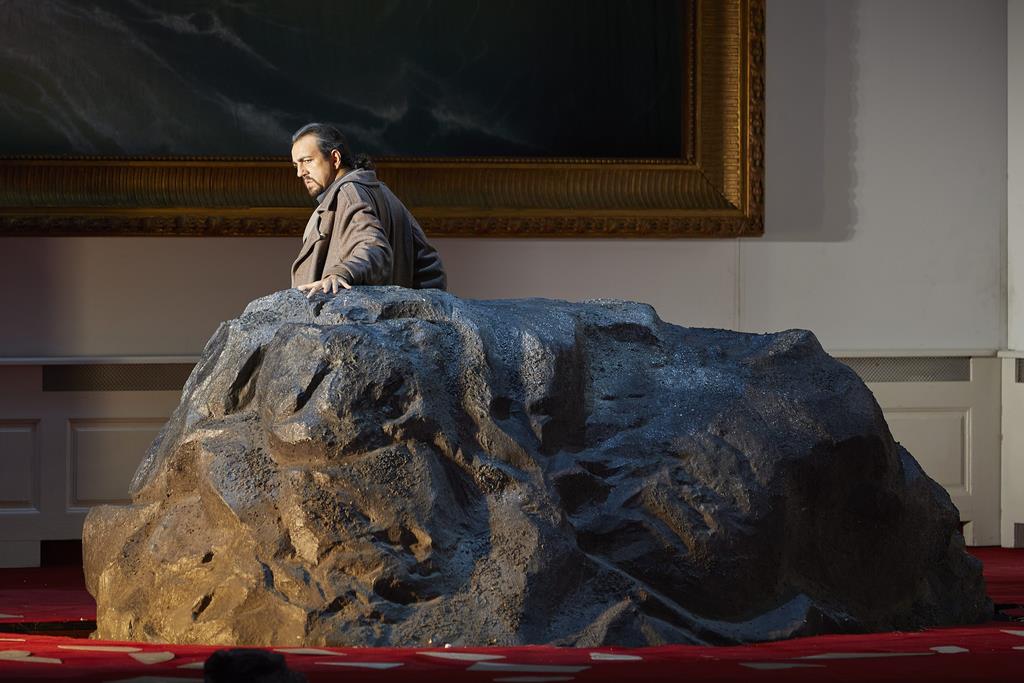 В абстрактно-статичном спектакле, оформленном Кристианом Шмидтом, всё привычно и стандартно, как мазня красной краской по стенам. Над действующими лицами, стоящими на сцене, нависает огромный камень или метеорит, пробивший потолок. Это — раздавливающая их судьба или риф, на который наскочил корабль Бокканегры. Другим элементом декораций является огромное зеркало. Оно то превращается в изображение бурного моря, то становится окном в другое измерение, где встречаются покойники.