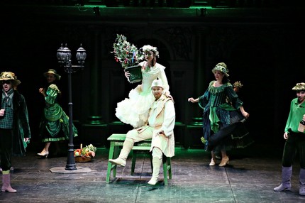 Он же и весьма эффектно одевает спектакль, гардероб которого лишь стилизован под эпоху кринолинов, камзолов и париков, хотя ни театральной пудры, ни нафталина как средства от залежалости в нем нет и в помине: пудра была бы явным перебором, а нафталин довольно свежему фасону костюмов вовсе не требуется! Но всей этой замкнутой, скрупулезно выстроенной режиссерско-сценографической конструкции, вращающейся вокруг вечных перипетий большой человеческой комедии, вокруг игры ради игры, явно требовался финальный росчерк, который придал бы лоск ее пластике и таинственность ее антуражу. Всё это спектакль как раз и приобретает благодаря балетмейстеру Владимиру Романовскому и действенно продуманной постановке света Ирины Вторниковой.
