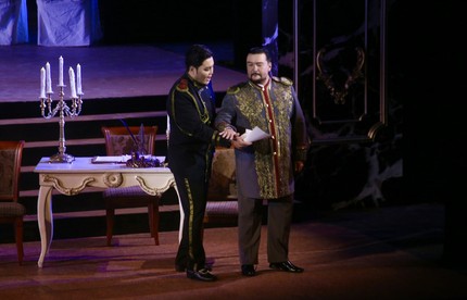 Однако место за дирижерским пультом гастрольного спектакля в Москве занял другой маэстро – Виталий Шевелев. Под его управлением партитура прозвучала изумительно — пленительно красочно, мобилизующе энергично, восхищая богатой палитрой выпукло-сочных акцентов и тончайших нюансов: кажется, музыку Верди музыканты постигли настолько глубоко, что она просто поселилась в них! На высоте оказался и хор (хормейстеры – Валерий Волчанецкий и Александр Саможапов). А главной интригой состава певцов-солистов обсуждаемого спектакля стала тройка исполнителей – наших старых добрых знакомых по прошлогодней московской «Тоске». Так что было весьма интересно узнать, какое впечатление они произведут в своих новых ролях…