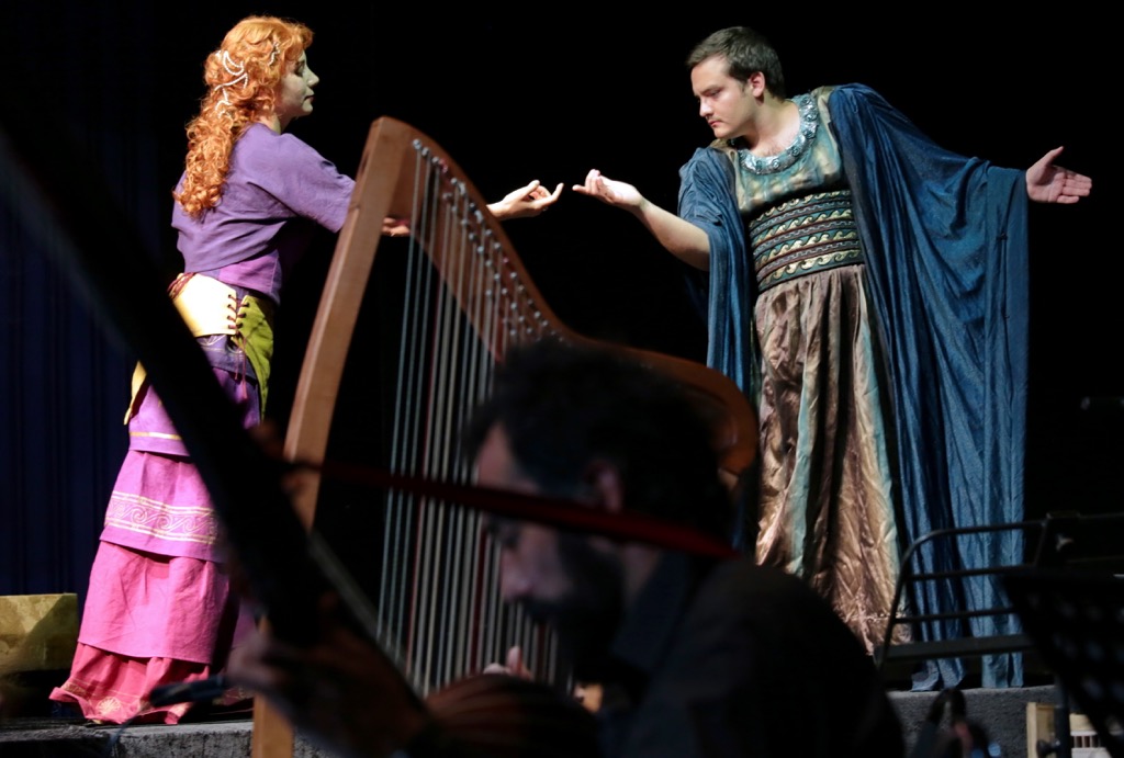 На сей раз всё зиждилось на музыкальном руководителе Эндрю Лоуренсе-Кинге, солировавшем на барочной арфе и фактически управлявшим левой половиной оркестра. Дело в том, что рассадка музыкантов была произведена по обе стороны сценического пространства: было видно, что раскладка составов сторон дублировала друг друга в части струнных из группы continuo. На левой половине выделялись рекордеры и всевозможные струнные, на правой – гобой и медные духовые. В результате подобной двусторонней рассадки удалось создать любопытный акустический «стереоэффект», хотя слаженность между двумя половинами оркестра не всегда была идеальной: и в группе струнных, и в правой группе духовых музыкантам зачастую приходилось ориентироваться на самих себя, играя на интуитивном автопилоте. Ассистентами музыкального руководителя в аспекте самóй постановки выступили Катерина Кинг (содиректор проекта, художник спектакля, специалист по барочному жесту) и Варвара Будылина (ассистент художника).