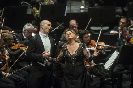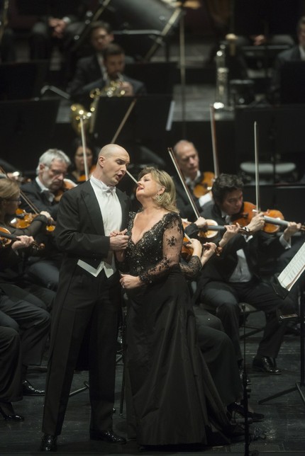 Это несколько снизило общий уровень впечатлений и на сей раз в Берлине, особенно финал «Травиаты» Верди, хотя с задачами подобного «драматического бельканто» на пике своей карьеры певица справлялась весьма успешно. Несколько подсокращенная выборка включила в себя и декламацию «Teneste la promessa», и арию Виолетты «Addio del passato», и ее дуэт с Альфредом «Parigi, o cara», и финальную речитацию главной героини. В отчаянно-страстной, разрывающей душу мелодике романсовой арии (досадно, что был спет всего лишь один куплет!) почувствовать фирменную груберовскую кантилену, плениться тонкими изгибами его интонаций и фразировки удалось на все сто процентов. В этом фрагменте вполне сноровистыми «помощниками» певицы оказались Мэтью Ньюлин (Альфред), Маркус Брюк (Жермон), Николь Хаслет (Аннина) и Эндрю Харрис (Доктор).