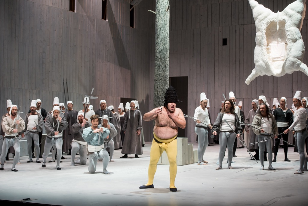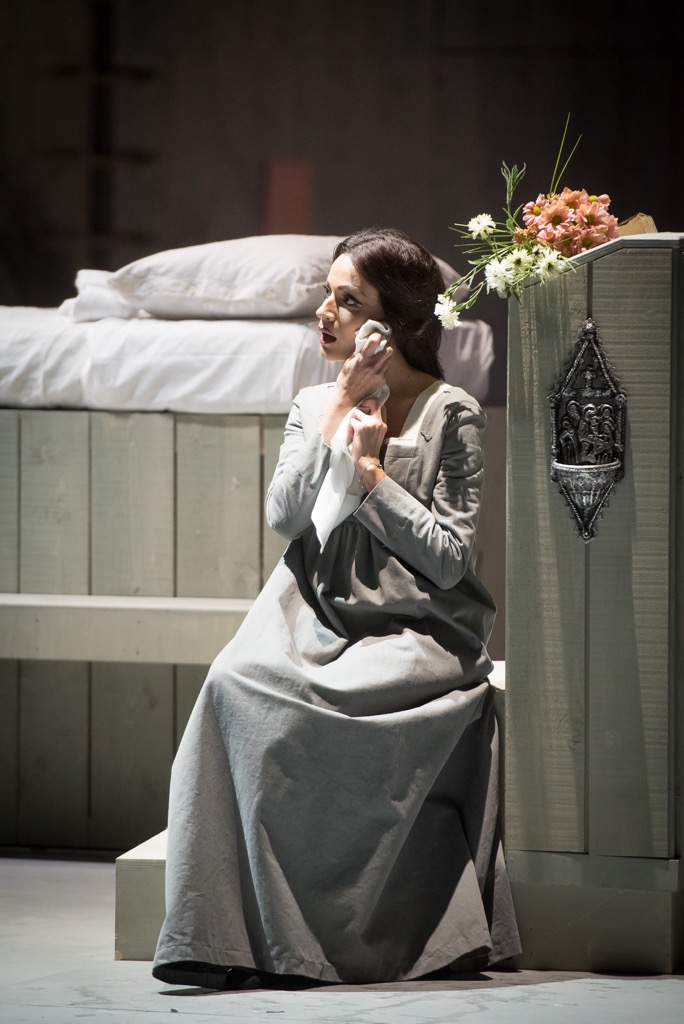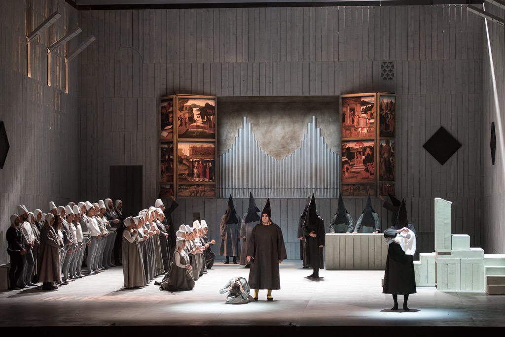 Не слишком большая сцена театра Комунале осталась «неодетой», сценическая коробка с трех сторон была «обшита» светлосерого цвета доской, пространство ни разу не было перенаселено, а, наоборот, почти всегда пустовато. Мало деталей, еще меньше мебели: дерево, шкура тельца, кровать, орган, картины на религиозные сюжеты, церковная кафедра. Мизансцены самые прозрачные и незамысловатые. Зато световая партитура была тщательно разработана Лучо Диана и завораживала изысканностью.