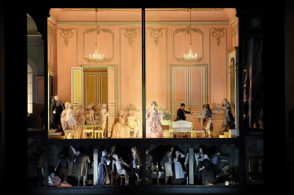 У Йонаса Кауфмана (Андре Шенье) уже около шести месяцев проблемы с голосом, и целесообразность подобных вокально ограниченных выступлений представляется сомнительной. В салоне графини де Куаньи (Хелена Зубанович) он ведёт себя неуклюже, показывая, что чужой в этих кругах, хотя бутылочка и примиряет его на время с графиней.