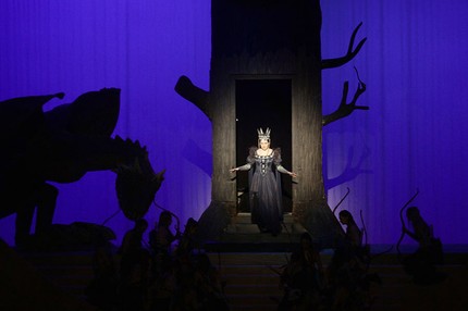 Как отмечал автор культовой саги «Властелин колец» Дж. Толкин, «Не трудно придумать зелёное солнце. Трудно придумать мир, в котором оно будет естественно». В этом отношении полёт фантазии австрийского художника-постановщика Хартмута Шергхофера весьма причудлив. Максимальное использование планшета сцены, плунжеров, видеоинсталляций (весьма эффектно смотрится анимационный полёт змея на фоне мерцающего звёздного неба) создают многослойную фантасмагорию сценического действия. Интересно художник использует арьерсцену – в виде круглого окна-камеры, из-за которого попеременно виднеется иссохшее дерево ночи и зелень зачарованной рощи.