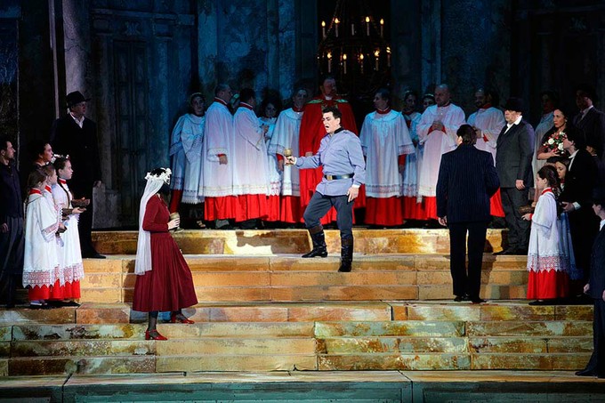 который «обнажённым нервом» держал драматическое напряжение спектакля, начиная с арии «Voi lo sapete, o mamma» («Знаете сами, мама») и заканчивая сценой раскаяния.