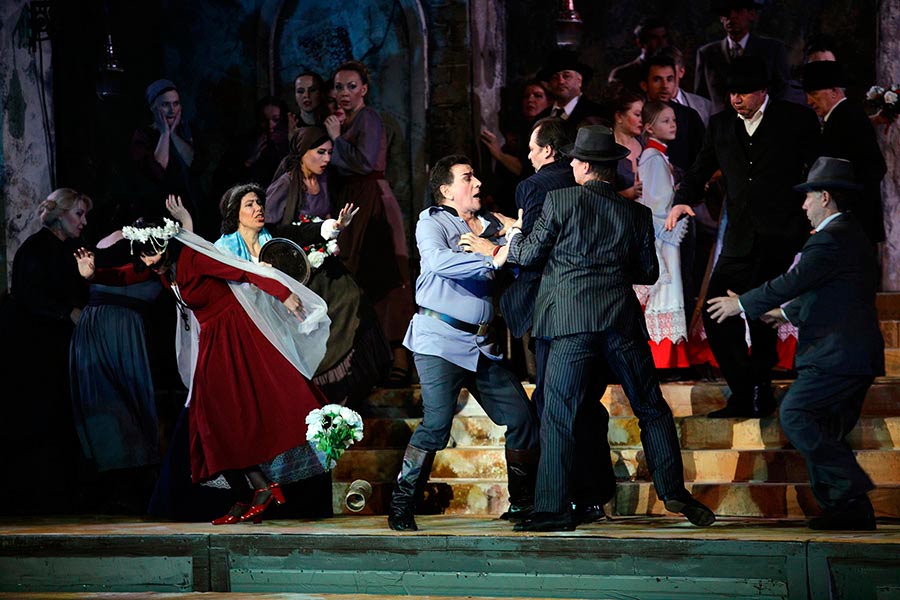 В новом спектакле «Сельская честь» российско-белорусского режиссёра Михаила Панджавидзе ощущается эстетика знаменитой постановки Франко Дзеффирелли. Всё тот же знакомый антураж Сицилии с церковью на главной площади, созданный замечательным художником Александром Костюченко; всё то же внешне неспешное, но внутренне напряжённое течение музыкально-сценического времени...