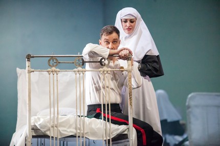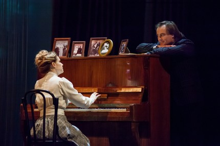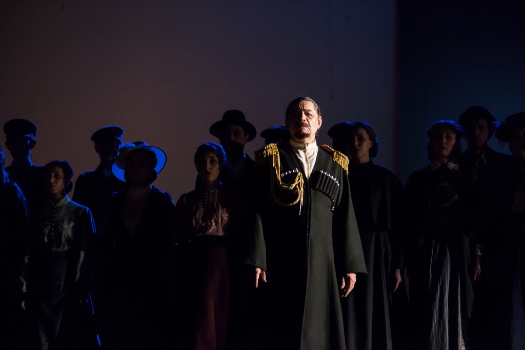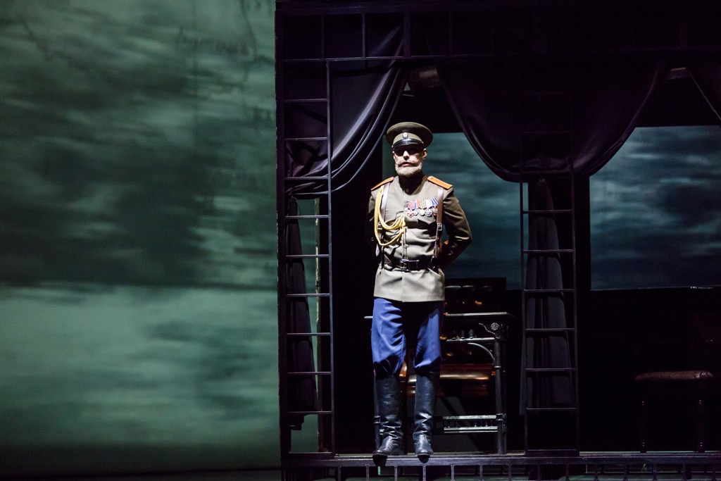 Есть в спектакле и фоновая музыка. Это фрагменты фортепианных ноктюрнов Глинки («Разлука») и Шопена, а также одной из прелюдий Рахманинова, фрагменты польки «Трик-трак» Иоганна Штрауса и Одиннадцатой симфонии Шостаковича («1905 год»). Это русская народная песня «Гэй, в саду пташечка», это и русские романсы («Очаровательные глазки», «Я обожаю», «Не уходи, побудь со мною» Николая Зубова, «Но это только сон» Леона Калишевского, «Сияла ночь» Николая Ширяева). А есть и романсы, которые, словно арии в опере, поет по ходу действия «самый певучий» персонаж спектакля Пётр Толстопят. На его счету – три соло («Обойми, поцелуй» Милия Балакирева, «Рвемся в бой» Юрия Морфесси, «Баллада о короле» Александра Вертинского), и Алексей Григорьев в партии Петра – точный выстрел в десятку: темпераментность и обнаженный нерв патриотизма проступают в нем и потрясающе сочно, и – что, казалось бы, несовместно – психологически тонко!