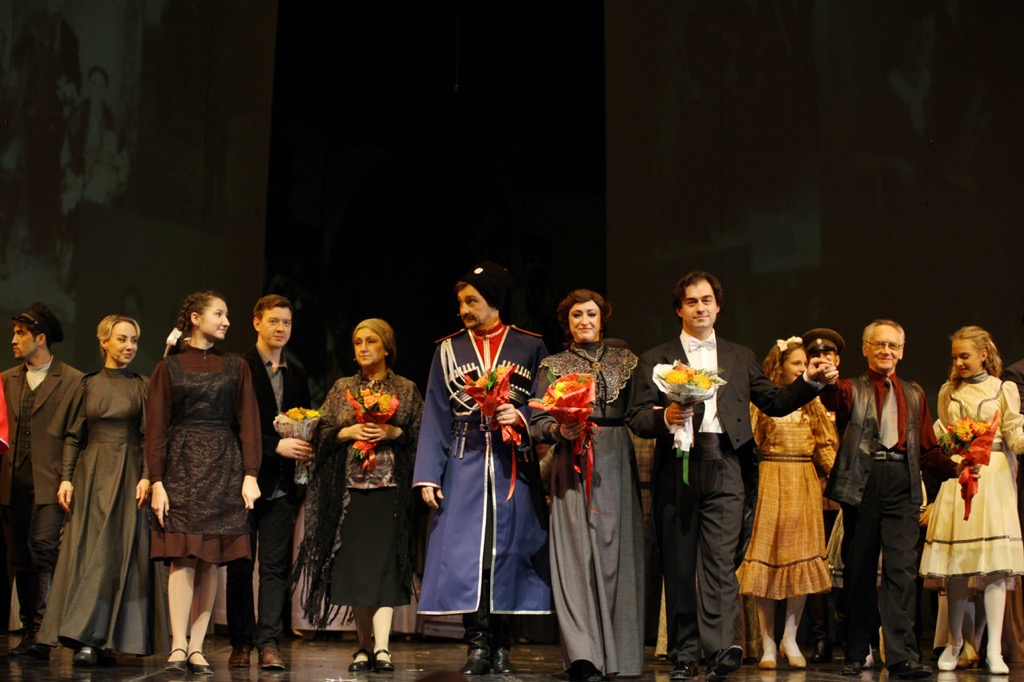 Пусть акапельные хоры, симфонически-хоровая и чисто оркестровая музыка звучат в спектакле фрагментарно, в прикладном аспекте, для Симфонического оркестра и Хора Музыкального театра шанс прикоснуться к такому потрясающе благодатному материалу можно расценить, как большую удачу. В этой музыке Оркестр и Хор раскрывают свой потенциал в полной мере, и творческий союз обоих коллективов с маэстро-дирижером правит свой очевидный триумф! Но и впечатление от этнически-фольклорного пласта – отнюдь не меньшее! И русские народные, и казачьи песни – «Милосердная сестра», «Вдоль по Питерской», «Ой, нэ розвывайся ты, сухый дубэ», «Ой, годи ж нам журытыся» (на слова казачьего атамана Антона Головатого), «Славные кубанцы» (песня линейных казаков, записанная на хуторе Кубанский) – в исполнении Ансамбля казачьей песни «Криница» звучат в обработке его руководителя Владимира Капаева. Неповторимый колорит эпохи создает Кубанский духовой оркестр, щедро даря яркие впечатления от старинного марша «Генерал Скобелев», «Военного марша» Свиридова из «Метели», вальса «Осенний сон» Арчибальда Джойса и «Встречного марша Кубанского казачьего войска», написанного руководителем этого коллектива Валентином Спиридоновым.