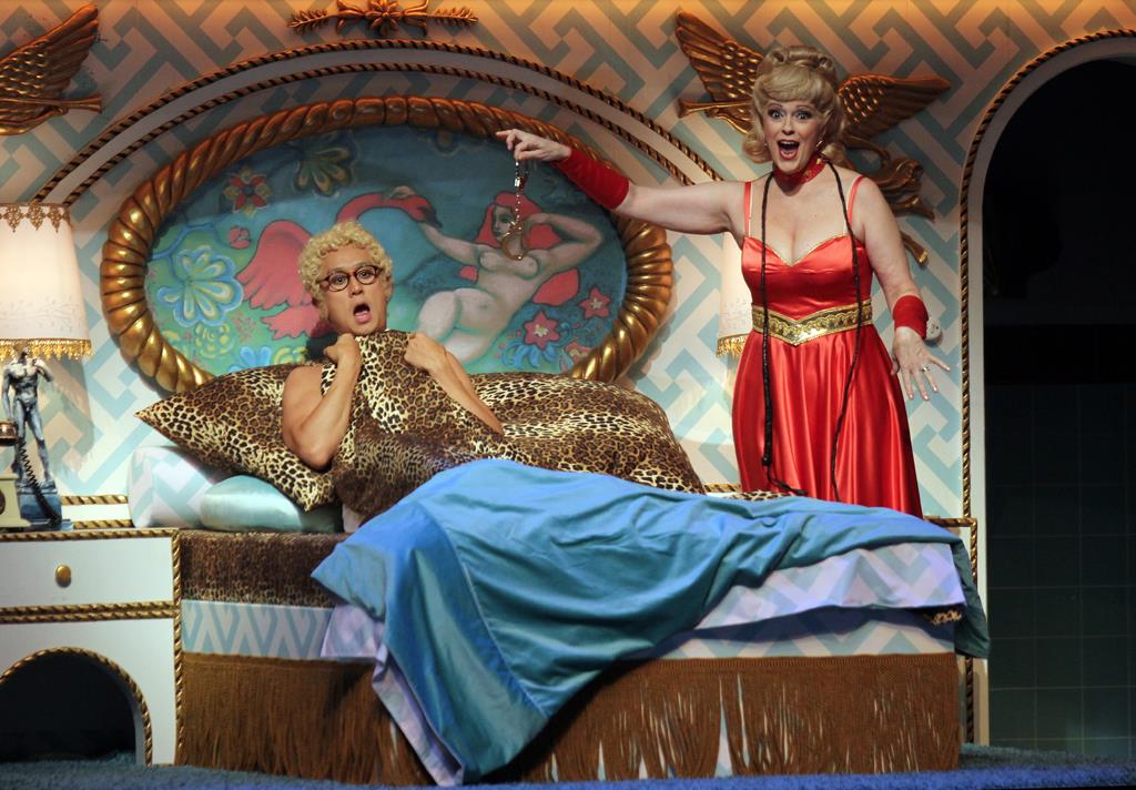 Другие греческие цари получились один другого веселее, и жаль, что им отведено мало сценического времени. Аякс I (Сергей Абабкин) и Аякс II (Юлиан Роде) – не слишком ловкие и не слишком смышлёные футболисты. Агамемнон (Виктор Рудь) в золотых «доспехах» блистательно всплывает с аквалангом из бассейна. От него не отстаёт Ахилл (Зияд Неме) – позолоченный король рок-н-ролла. Орест (Макс Эмануэль Ценчич) в окружении «гетер» призывает всю компанию веселиться и радоваться за народные деньги.