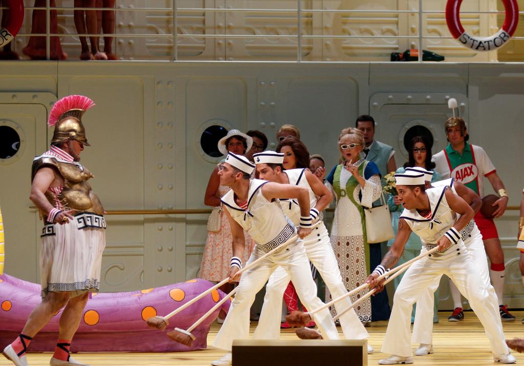 31 декабря в зале Гамбургской оперы гудел круизный лайнер «Jupiter Statur». С его борта кудрявый Парис похитил Елену со следами былой красоты. Речь о постановке оперетты Жака Оффенбаха «Прекрасная Елена», осуществлённой франко-канадским творческим тандемом Barbe & Doucet (режиссёр и хореограф Рено Дусе, сценограф Андре Барбе).