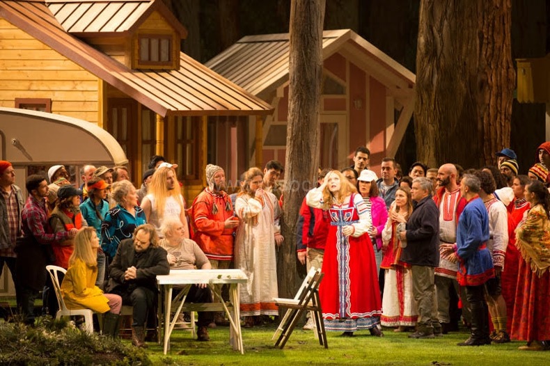 Очеловеченные персонажи из сферы языческой старины и обожествленной природы – Весна-Красна, Дез Мороз и их дочка Снегурочка – впервые появляются в прологе оперы в классе детской музыкальной школы. Весна-Красна (ни дать ни взять типаж Мадам Грицацуевой!) – гротесково-комичная мать-«педагогиня». Дед Мороз – хрестоматийный отец-подкаблучник, приведший дитя-подростка на «грозный» родительский суд матери. Сама же Снегурочка – типичная героиня детских новогодних утренников в белом скромном пальтишке, отороченном мехом, и белой шапочке с помпончиком. На четыре основных акта оперы – один и тот же лес, хотя и с некоторыми вариациями. В первых двух актах в этом лесу мы видим лагерь общины, в котором вместе со всеми, в сáмой гуще народа, живет и весьма демократичный Царь Берендей. Все расселены в дачных домиках, лишь только Бобыль и Бобылиха с принятой ими в семью Снегурочкой живут в трейлере – такое вот «социальное неравенство», бьющее не в бровь, а в глаз! В последних двух актах никаких поселений уже нет – один сплошной лес, от монотонности которого, несмотря на всю его реалистичную живописность, к финалу изрядно устаешь…