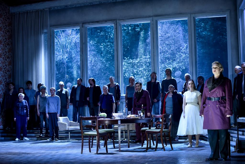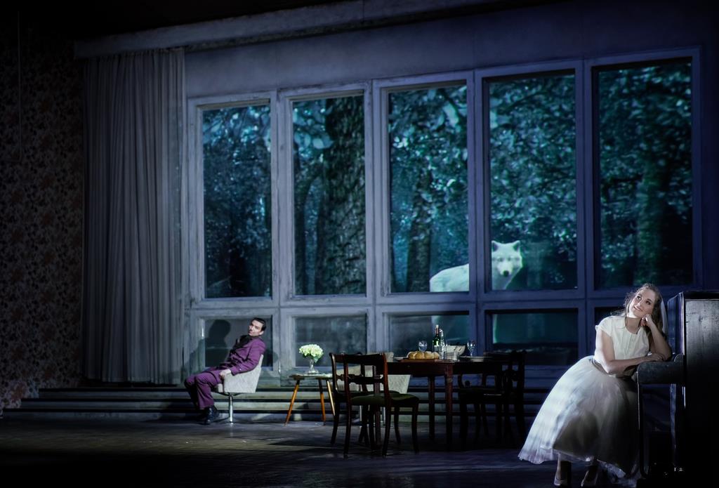Леонора пела свою арию перед опущенным черным занавесом, что невольно наводило на мысль о том, что кроме использования видеопроекций, падающих в камеру капель и радио, режиссёру нечего предложить в плане постановочных решений.