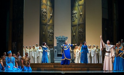 Сценографическая идея гениально проста: конструкции со скользящими перегородками-ширмами – одни и те же на все акты. Их перекрестие в центре и есть куб храма, а боковые панели стилизованы вавилонскими барельефами, которые в первом акте за счет искусных манипуляций со светом поначалу приглушены, и в финале этого акта храм с помощью видеографики эффектно «занимается пламенем». В трех других актах на месте храма – тронный зал на фоне идола Ваала. В финале оперы раскаявшийся Набукко, к которому после молитвы Богу иудеев возвращается разум, весьма реалистично повергает идола в прах, но и это – искуснейшая видеографика.