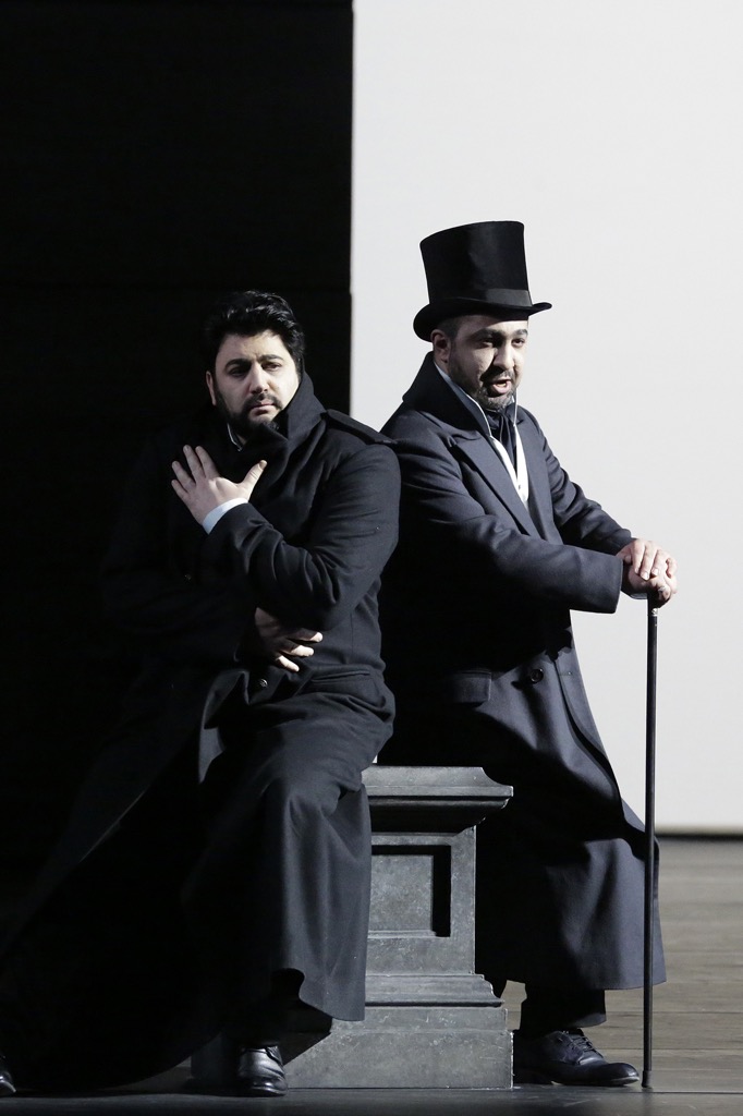 Ничего не значащий примитив абстрактной «геометрически-наборной» сценографии Адомаса Яцовскиса являет взору мрачную конструктивистскую коробку практически пустой, голой сцены. Как известно, сюжет либретто Модеста Чайковского по одноименной повести Александра Пушкина перенесен из первой половины XIX века в екатерининскую эпоху, то есть во вторую половину XVIII века, но скроенные по современному лекалу костюмы Марии Даниловой стилизованы, скорее, под XIX век либо даже под начало XX-го. Их цветовая гамма – не только черное, белое и «пятьдесят оттенков серого», но и неярко размытые цветные тона.