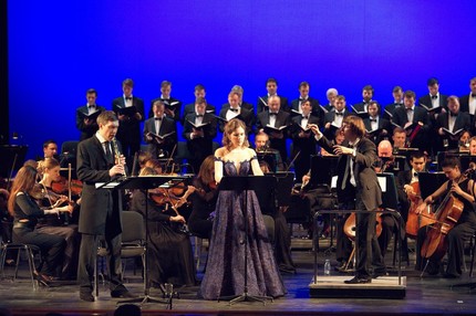 Бетховен (первое отделение программы) был представлен двумя произведениями – Концертной арией «Ah! Perfido» («Ах! Коварный») для сопрано с оркестром (1796, op. 65) и Фантазией для фортепиано, хора и оркестра (1808, op. 80) с немецким текстом хорового финала Кристофа Куфнера. Мейербер (второе отделение) околдовал наивной, но поистине волшебной, виртуозно-техничной изобретательностью музыкального письма в Драматической кантате «Gli Amori di Teolinda» («Любовь Теолинды») для сопрано, кларнета, мужского хора и оркестра (1816) на слова Гаэтано Росси. Представление Кантаты стало первым исполнением этого опуса в России и на фоне общей раритетности программы оказалось заведомо главной изюминкой вечера.