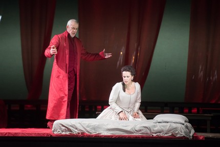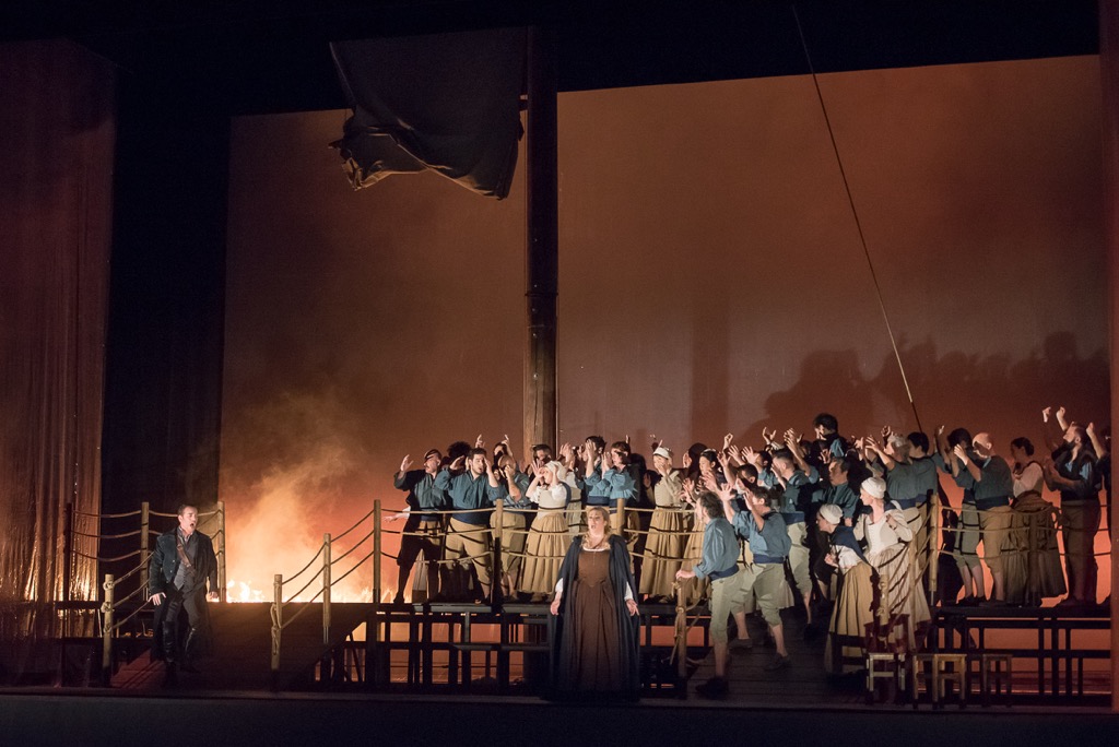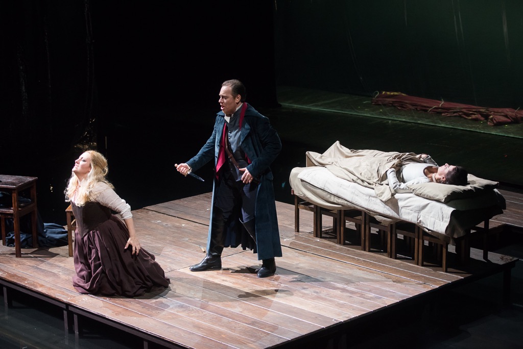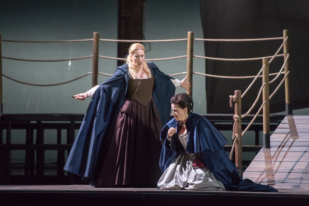 Сценограф Андреа Белли не воссоздал, а создал Венецию поразительно малыми средствами. Из ничего, можно было бы сказать. Этим «ничем» стали большие куски прозрачного целлофана, весьма похожего на занавески в ванной. Благодаря тонким световым эффектам Фьямметты Бальдисерри они создали поэтический эффект венецианского неба и венецианской воды. Небо лагуны далеко не всегда бывает открыточным ярко-синим, оно часто серо-голубое и в легкой дымке, в полной гармонии с дворцами венецианской знати, вырастающими из воды, и покачивающимися в грязноватой воде гондолами. В первом действии знамя с изображением льва Святого Марка и пара свай полностью довершили иллюзию.