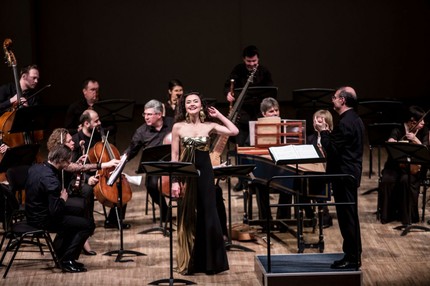 Стефани д’Устрак — личность легендарная, внучатая племянница Франсиса Пуленка и правнучатая племянница Жака де Лапреля, ученица Уильяма Кристи, партнерша по сцене многих музыкальных знаменитостей. На фестивале «Опера априори» с оркестром Рудина Musica Viva она выступает второй раз, первый раз в мае 2014 года она привозила программу произведений Гектора Берлиоза. Тогда на сцене Большого зала консерватории московскому слушателю был представлен редкий для Москвы материал – кантату «La Mort de Cléopâtre» («Смерть Клеопатры») и песенный цикл «Les nuits d’été» («Летние ночи»). Однако, д’Устрак все-таки наиболее известна в своем исходном амплуа барочной певицы, поэтому программа французского барокко была заведомо интересна. В нынешнем концерте были исполнены произведения Люлли, Шарпантье, Кампра, Рамо и Глюка.