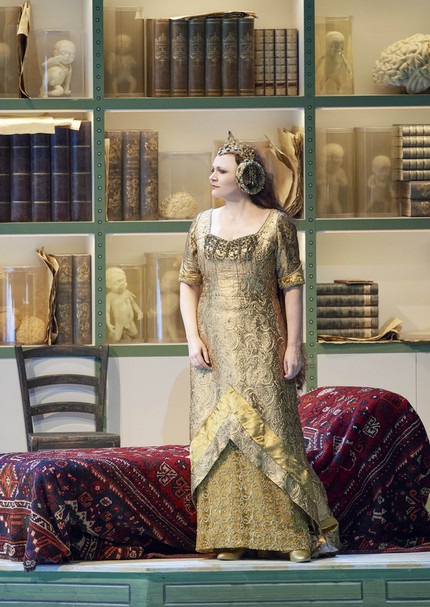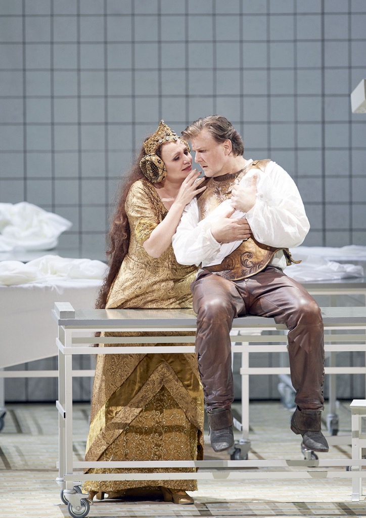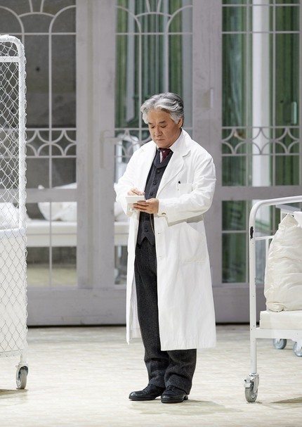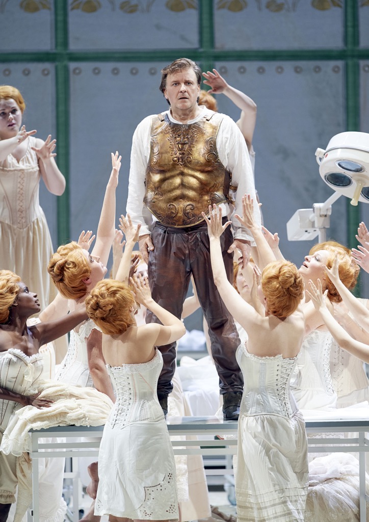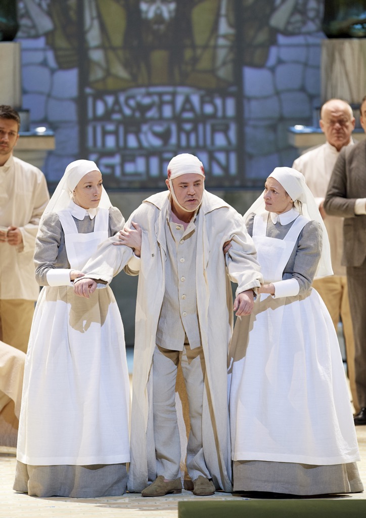 Я не буду углубляться в описание того, как режиссёр работает со сценическим пространством, лишь отмечу безусловно удачное зональное структурирование сцены, иллюстративно внятные видеоинсталляции Инеты Сипуновой (многие с текстом либретто, хотя сегодня в Венской опере либретто транслируется на шести языках, включая русский), игру со светом и цветом, исключительное внимание к деталям (достаточно посмотреть, чем заполнены шкафы в кабинетах Гурнеманца и Клингзора, которые в новой инсценировке – два конкурирующих врача одной клиники) и прямолинейность аллюзий, вызываемых палитрой костюмов работы Кристине Юрьяне (там не только сплошной «Сецессион», там и весь романтизм в последней сцене выхода «вагнеровских персонажей» перетрясён, как пыльные ковры, которыми укрыта фрейдовская кушетка в правой части сцены).