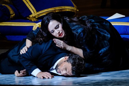 В партии Эболи латвийская меццо-сопрано Элина Гаранча – абсолютная супердива нашего времени! – ожидаемо производит фурор и как универсальная певица, и как обворожительно-фактурная актриса, и, кажется, французская ипостась этого образа для нее наиболее естественна и органична. Ожидания в отношении болгарской сопрано Сони Йончевой были не столь ясны и категоричны, но именно «французская» Елизавета Валуа становится одним из ее выдающихся сценических достижений. Так совпало, что уже после обсуждаемой кинотрансляции довелось переслушать четырехактного итальянского «Дон Карлоса» в Большом театре России, и автор этих строк еще раз убедился в том, насколько партии Елизаветы в двух редакциях разнятся по степени их драматического накала!