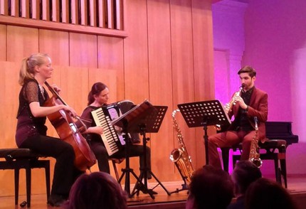 Каждый из солистов трио – музыкант высочайшего уровня. Глубокий, проникновенно «поющий» тембр виолончели (инструмента, академически ангажированного довольно широко) на слух ложится наиболее привычно, а звуковедение Каролины Оман потрясающе акцентировано и предельно открыто: оно словно книга, которую невероятно легко читать. Но саксофон, а тем более аккордеон, в каноны музыкального академизма вписываются гораздо сложнее. И всё же то, что в своих музыкальных сферах так мастерски смогли сделать и Йонас Чанц, сыгравший для нас на тройной линейке саксофонов (сопрано, теноре и альте), и Оливия Штаймель, аккордеон которой способен был звучать, словно маленький «живой» духовой оргáн, оказалось невероятно интересно и притягательно!