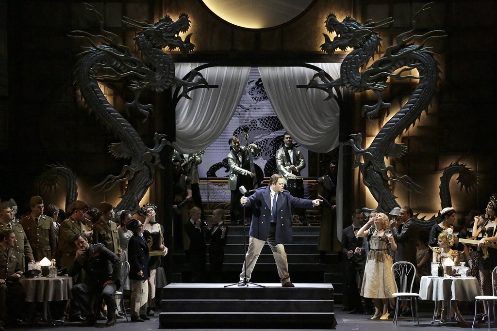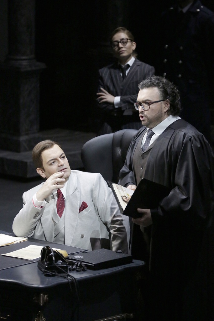 Ричард – губернатор Бостона, пусть середины XX века, типичный американец с пузиком и ногами на столе, но все-таки по тексту оперы. Разлетающиеся в зал хичкоковские птицы, зловещие голые ветви деревьев и прочие, весьма эффектные и современные элементы видеодизайна завораживают зрителя и особенно жалеть об отсутствии камзолов не заставляют.
