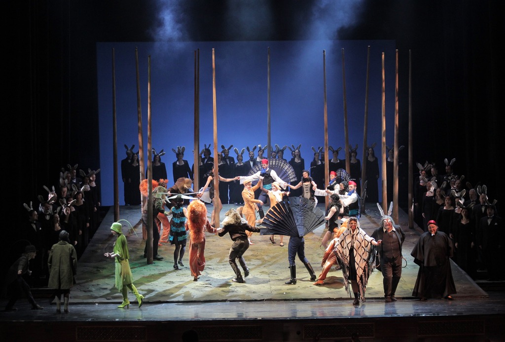 В цикле жизни Быстроушки от рождения до смерти, приходящей с роковым выстрелом охотника Гарашты, есть и лесная свадьба с лисом Златогривеком, и продолжение рода, и воспитание потомства. Вся цепь событий перемешана с воспоминаниями Лесничего о его давно ушедшей молодости, но фон этих событий – жизненные коллизии и других персонажей, завязанных в один философский узел с жизнью Лесничего. Сюжет возник из комикса, так что перед нами вроде бы опера комическая, но постановка трактует ее и как психологическую драму, и даже в какой-то мере как просветленную трагедию. Музыка, вобравшая в себя звучание моравских наигрышей и напевов, и вправду светла – в высоком трагедийно-патетическом смысле овеяна светлой печалью и грустью минувших лет. Ее постимпрессионистские мотивы контрастируют с изысканно-мелодическим романтизмом – почти импрессионизмом – «Русалки» хотя и осязаемо, но всё же довольно тонко.