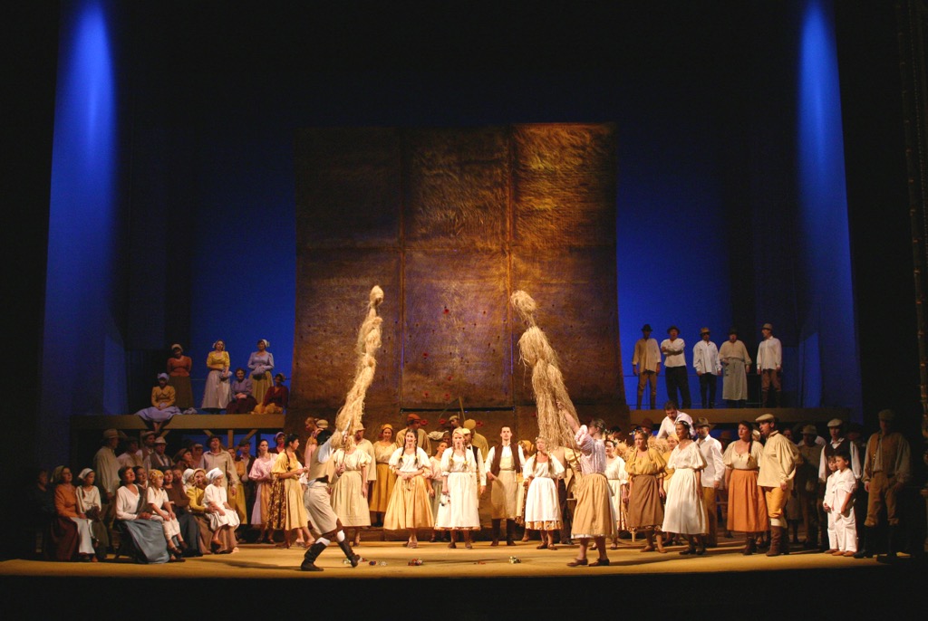 Этот ход симпатичен и мил, но ведь и чешское бельканто – фактура номерная, и главное в нём – музыкальные номера. Зачин очарования ими – прелестная монументальная увертюра, а абстрактная каркасно-щитовая сценография Петра Матасека с сеном, снопами колосьев и огоньками «живых» цветочков для такого сюжета – просто идеальная semi-stage среда-трансформер. При этом многоцветно-пестрые артикулы национальных костюмов, которыми щедро одаривает взор художник Зузана Пржидалова, суть театральный гардероб, вполне оптимальный как в разумной необходимости, так и в абсолютной достаточности.