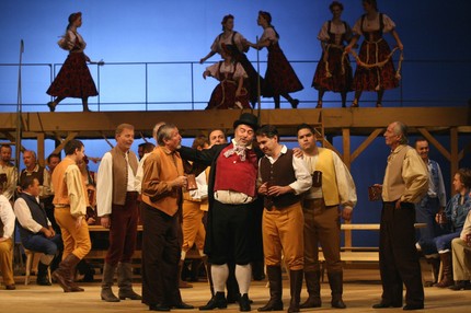 Сметана для чехов значит столько же много, сколько для нас Глинка, и это говорит о том, что встреча на постановке «Проданной невесты» с красивым пением – то главное, ради чего и нужно было на нее стремиться. И пусть язык либретто Карела Сабины – не итальянский, а чешский, отказать этой партитуре в музыкальном изяществе и чудесном мелодизме крайне сложно. Сюжет апеллирует к идиллии богемской деревни в период праздника сбора урожая, так что в опере есть и сюита танцев: полька, фуриант и скочна. Последний в третьем акте – музыка для фактически вставной, хотя и законной сюжетной интермедии бродячего цирка. Словно взывая к водевильной родословной опуса, на сей раз эта вставка – поистине феерическое воздушно-акробатическое представление, спектакль в спектакле с привлечением профессиональных артистов соответствующего жанра.