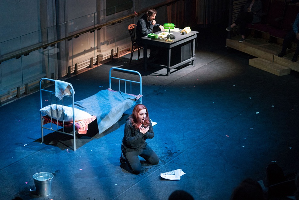 Евгения Асанова в данном случае не только меццо-сопрано, спевшая «элегантный образчик венского классицизма» предельно точно, изящно и со вкусом, но и неприкаянная барышня «из соседнего подъезда». То она в халатике после душа пьёт чай и ложится спать, то вскакивает, проворно одевает драные джинсы, отвечает на звонок мобильника, пишет мелкие записочки-липучки. Под конец, «жалка и покинута» торопливо высыпает кучу капсул в остывший чай и ложится, свернувшись калачиком, достав и положив рядом, как знак «нити Ариадны», клубок и спицы. История запомнилась прежде всего как «бенефис» Евгении Асановой, открывшейся с новой вокальной и актёрской стороны.