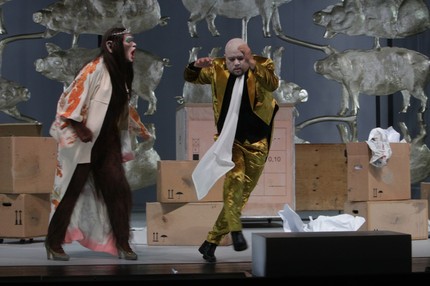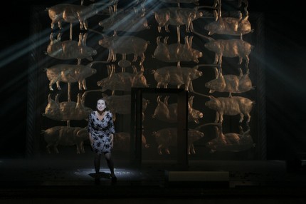 В открывающей оперу пасторали смешались картонные овечки и плюшевые зайчики, ангелочки в стиле бидермейер, рокайльные розово-голубые платья и китчевое сердце, носимое Энн Трулав («истинная любовь»). Несколько резковатое по тембру сопрано Марисоль Шалит в финальных сценах достигло нужного уровня прозрачной трогательности. Возвращения Тома она ожидала на фоне золотых свинок: неспроста копилки часто бывают в виде свиней – символа счастья, плодовитости и богатства.